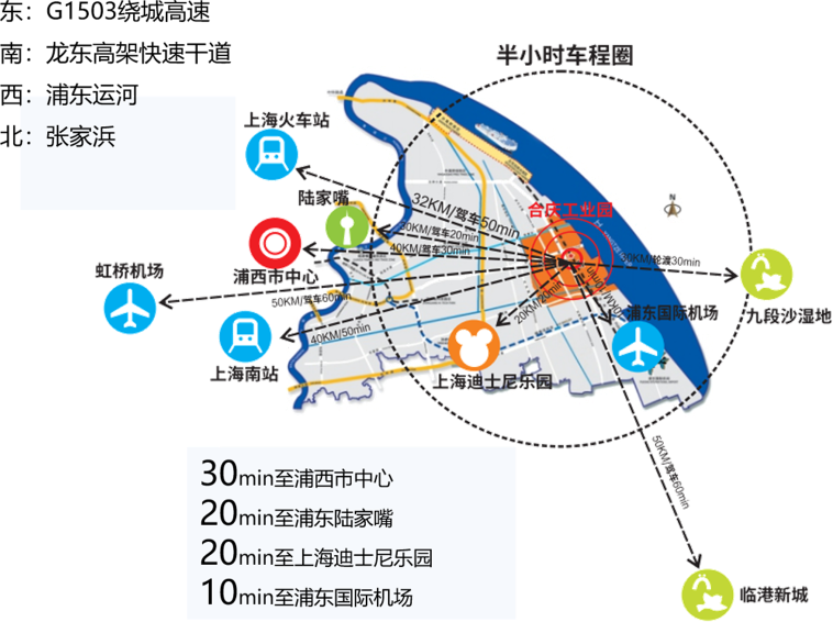 合庆镇拥有得天独厚的区位优势,境内由华夏高架、龙东高架、G1503高速路等主要道路组成了“三横三纵”交通路网,纵横通衢连八方的区位优势为合庆的发展和升级奠定了基础。距浦东国际机场、上海火车东站仅15分钟车程,距陆家嘴金融贸易区、外高桥保税区、迪士尼度假区30分钟车程,距人民广场、临港自由贸易试验区40分钟车程。